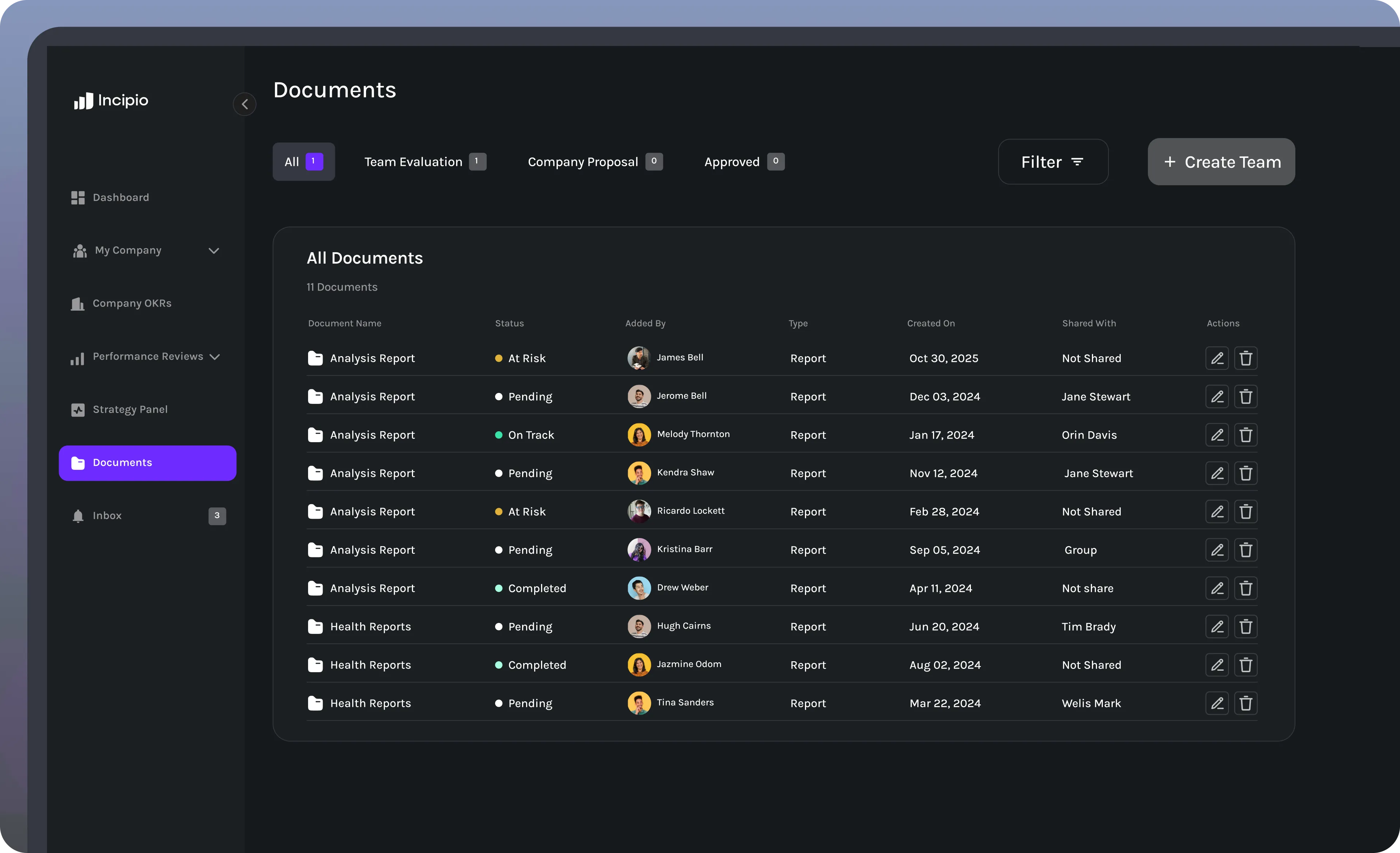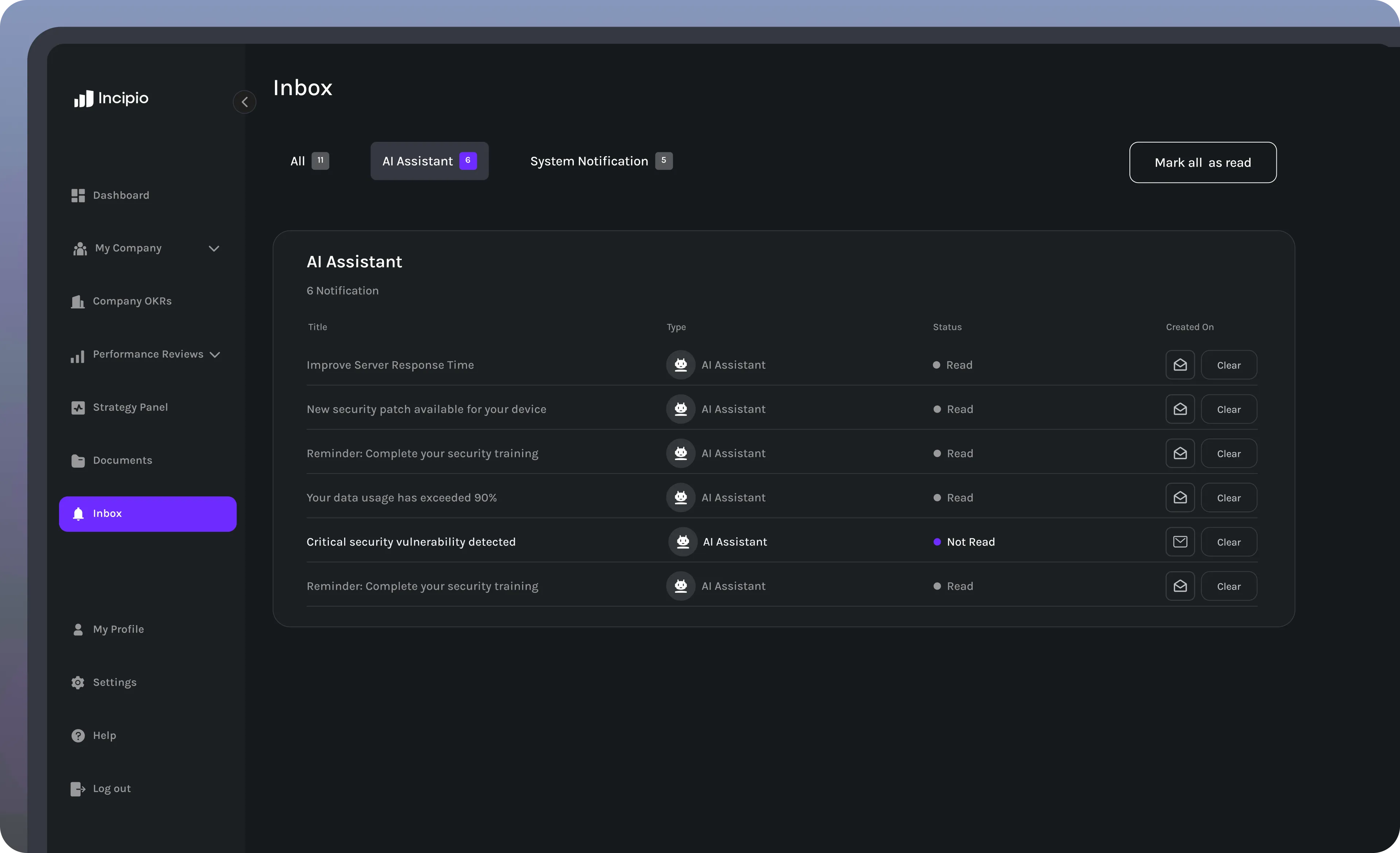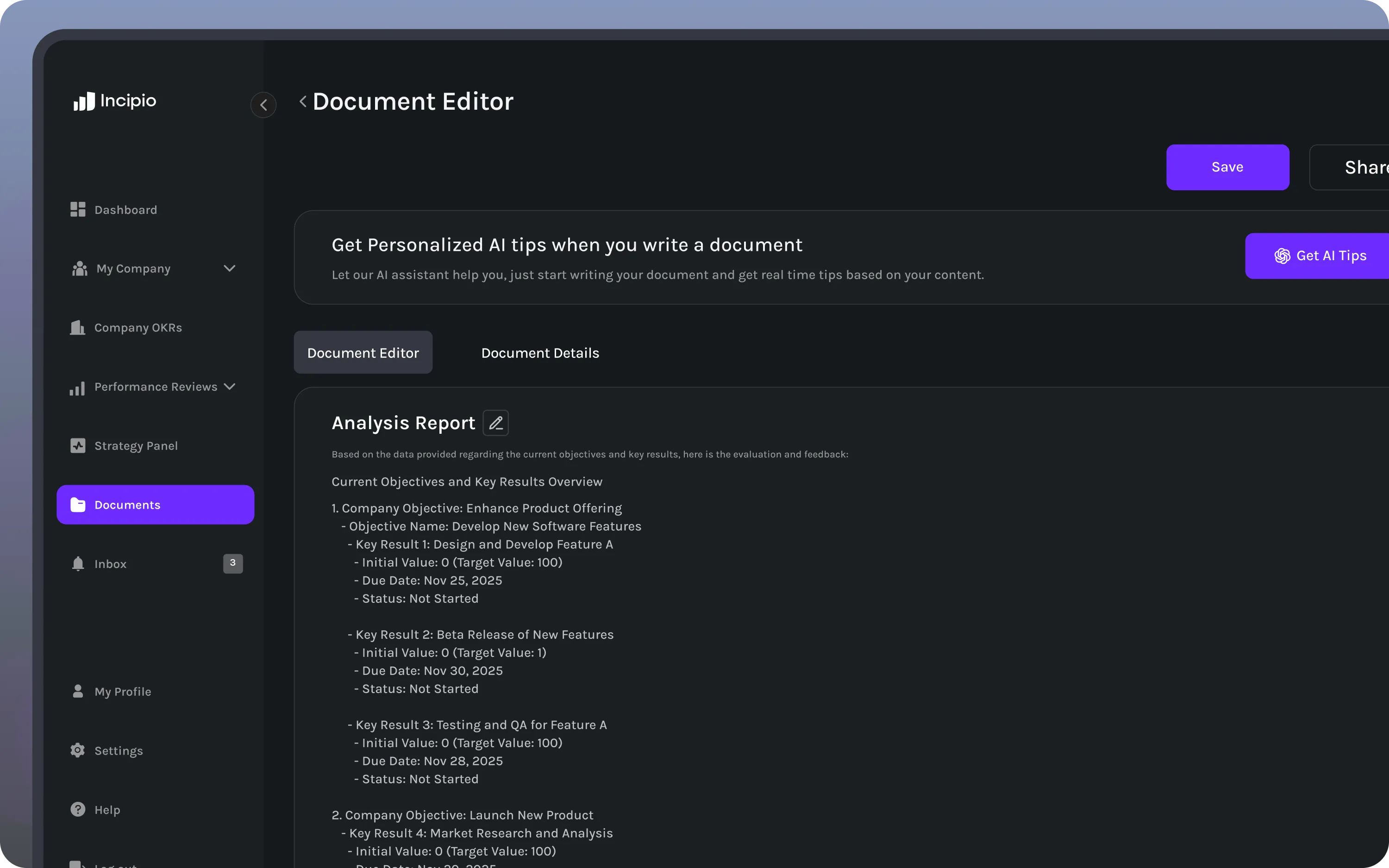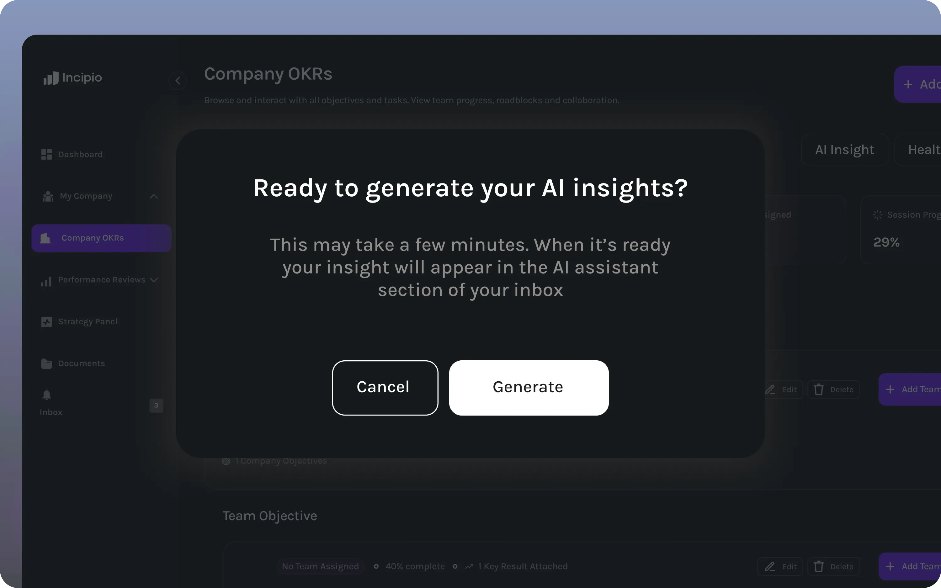 Turn data into daily action. Incipio’s AI Assistant learns from results and helps leaders refine goals, reviews, and strategy alignment over time.