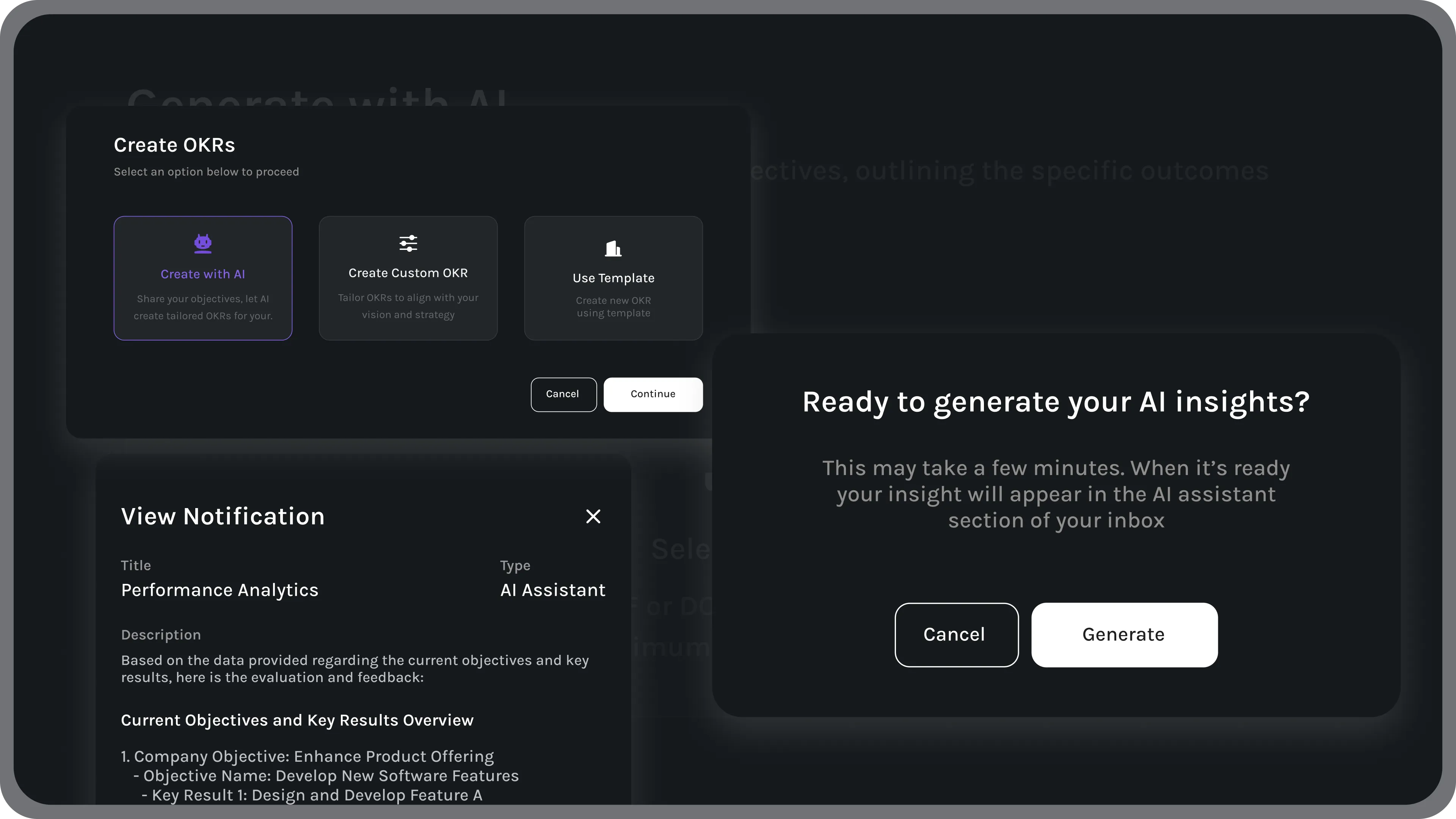 The AI Assistant identifies shifts in performance and recommends next steps in real time. Automate reminders, generate updates, and keep objectives aligned without manual check-ins.