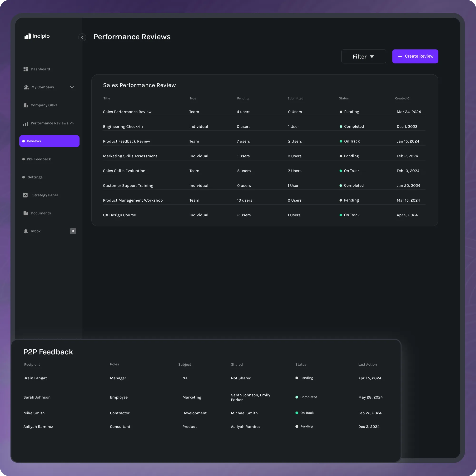 Incipio centralizes peer reviews, recognition notes, and performance comments into one view. See how every piece of feedback ties back to goals, culture, and outcomes—so leaders can coach with clarity and employees grow with purpose.