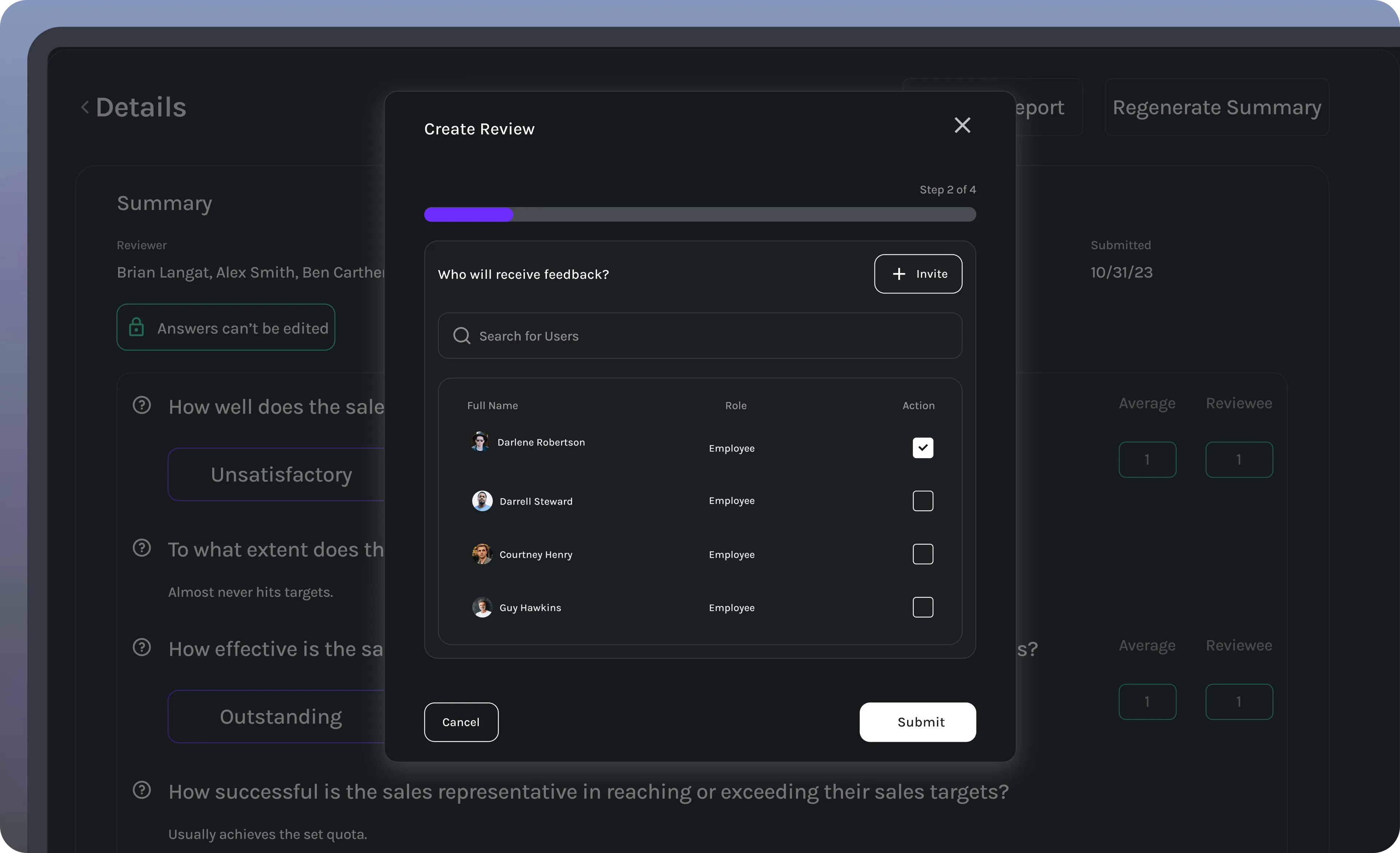 Encourage open communication with structured feedback cycles. Capture input that helps employees understand their impact, improve collaboration, and align with company goals.