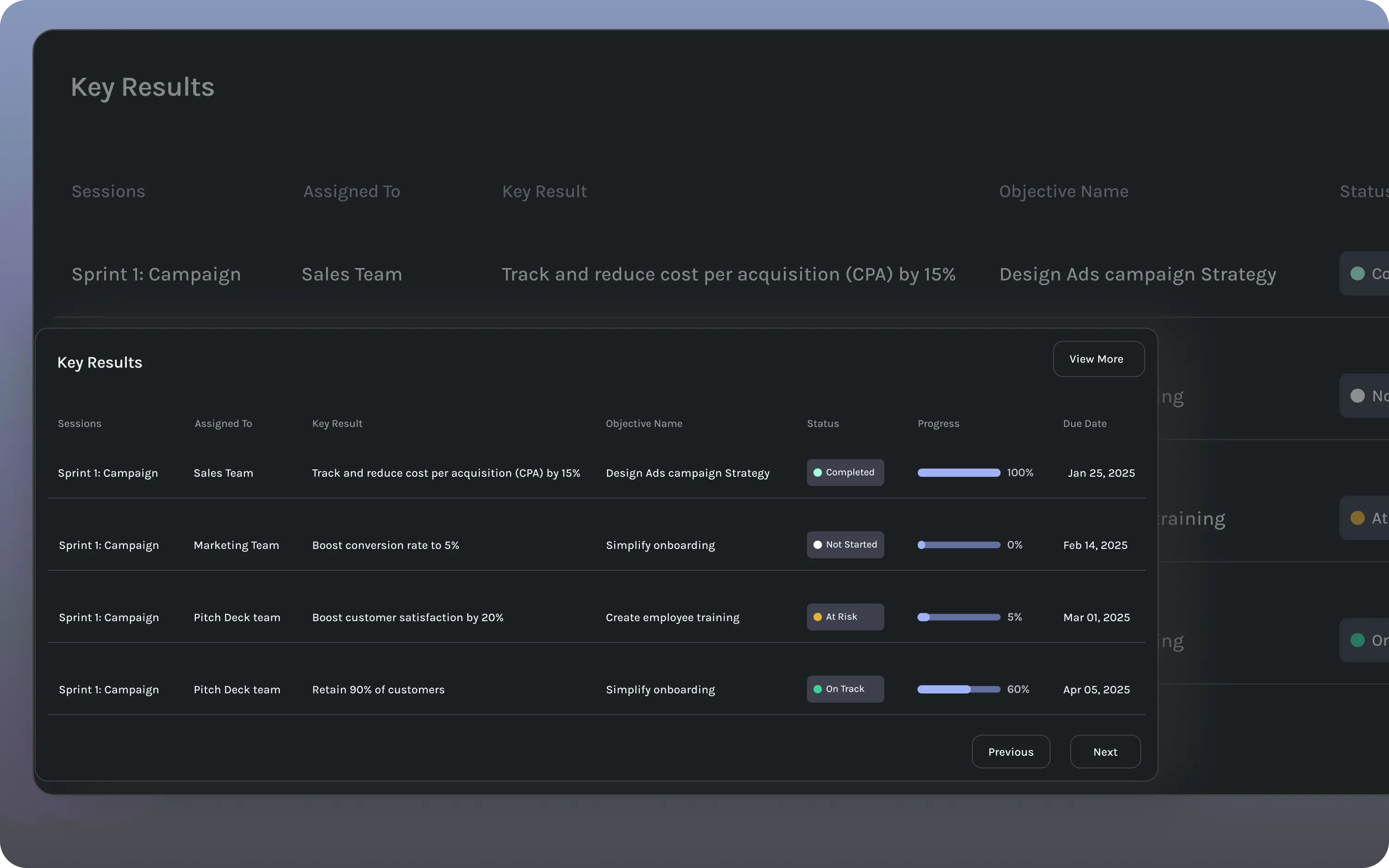 Understand how company-wide objectives are tracking and where alignment is breaking down. Identify which goals are propelling the business forward and which need recalibration.
