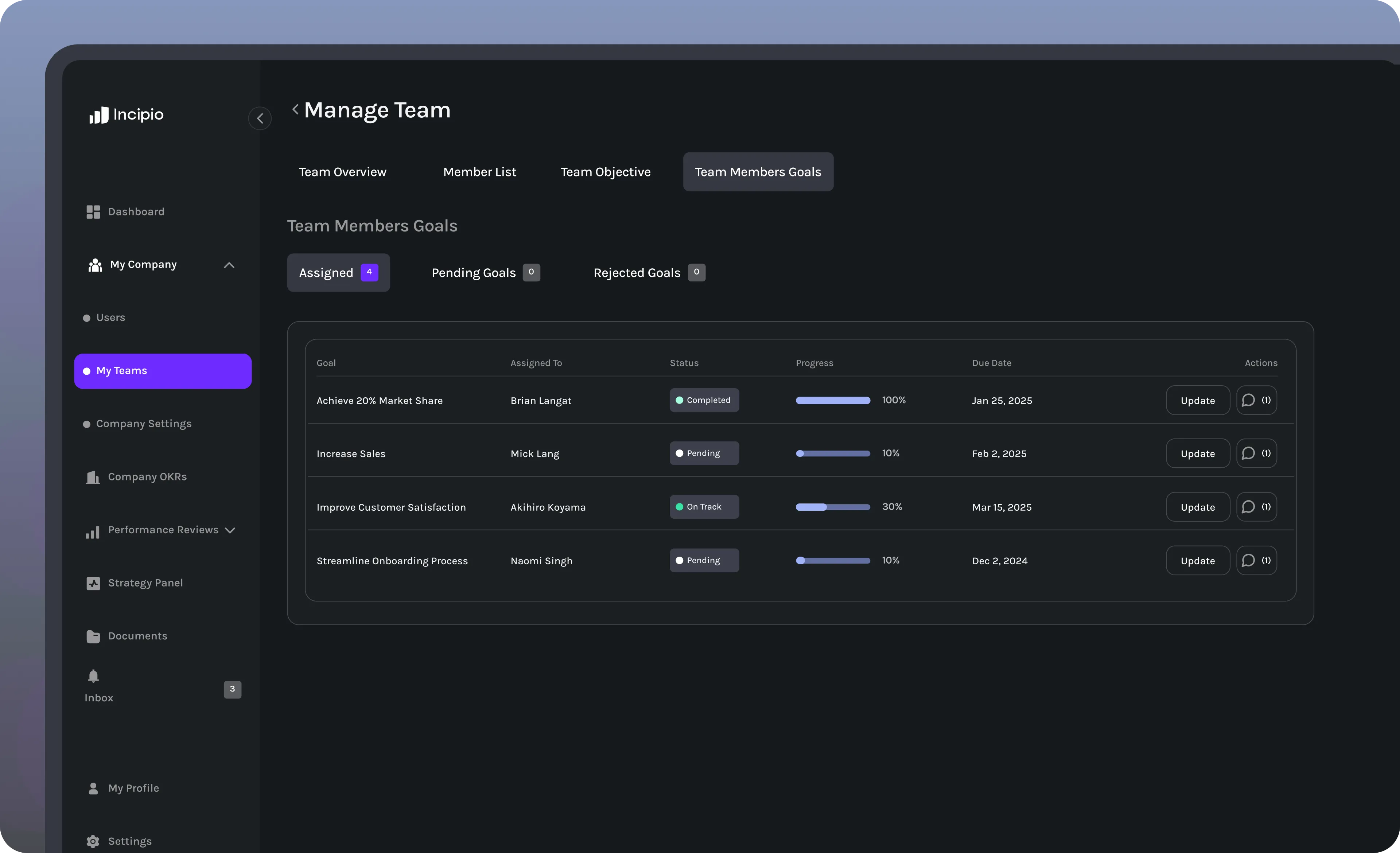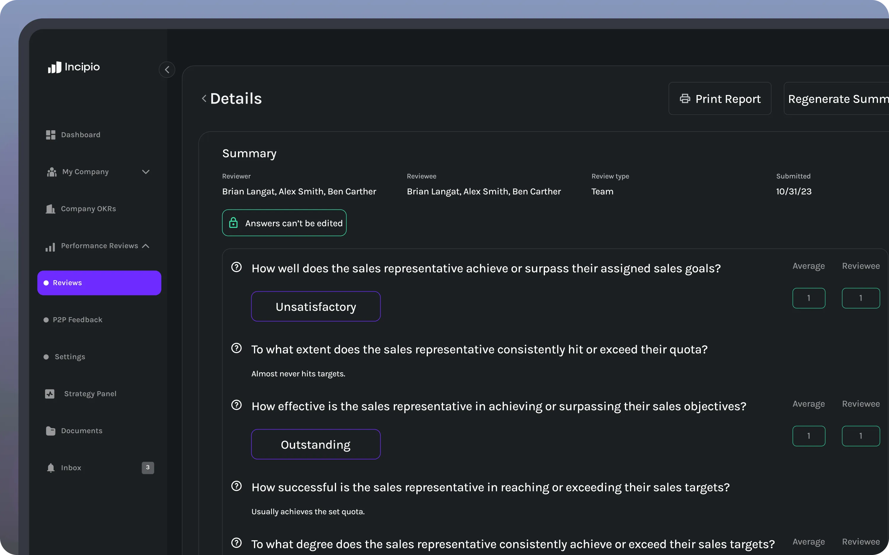 Incipio Health Reports analyze goals, reviews, and engagement data to uncover the full picture of performance. Each layer reveals a different signal about how your company is operating beneath the surface.