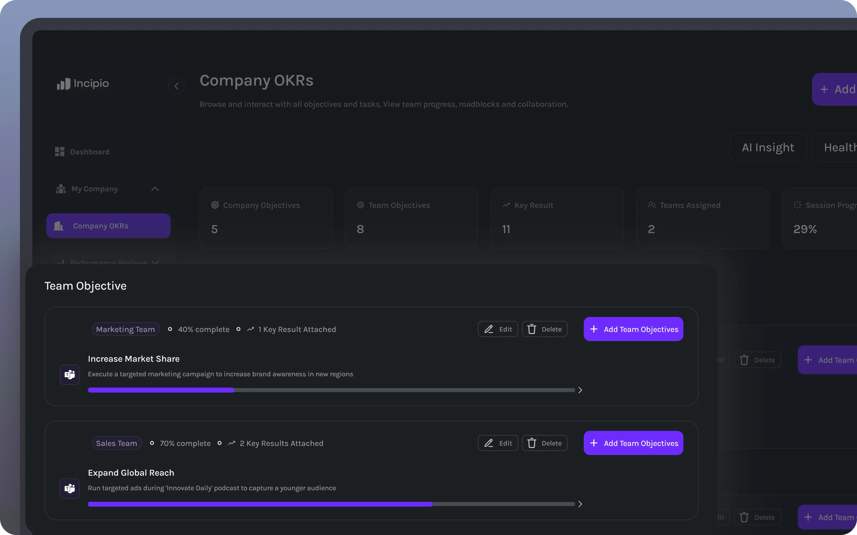 Align goals and drive progress across every level. Incipio helps you define objectives, cascade priorities, and measure results through one structured OKR system that keeps strategy visible and execution consistent.