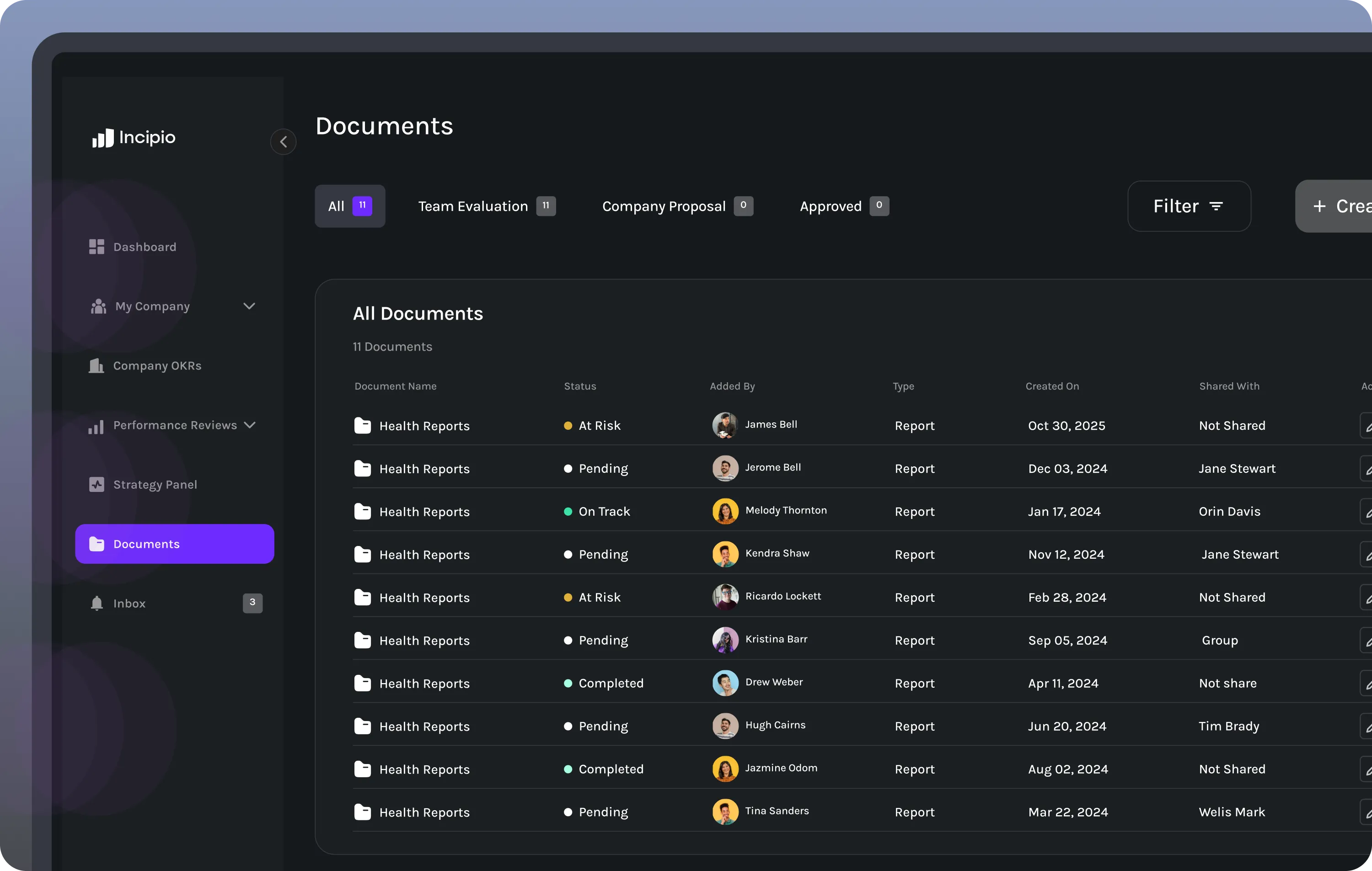 Visualize company health in real time. Incipio aggregates key performance data into clear reports that reveal alignment strength, progress trends, and areas needing attention.